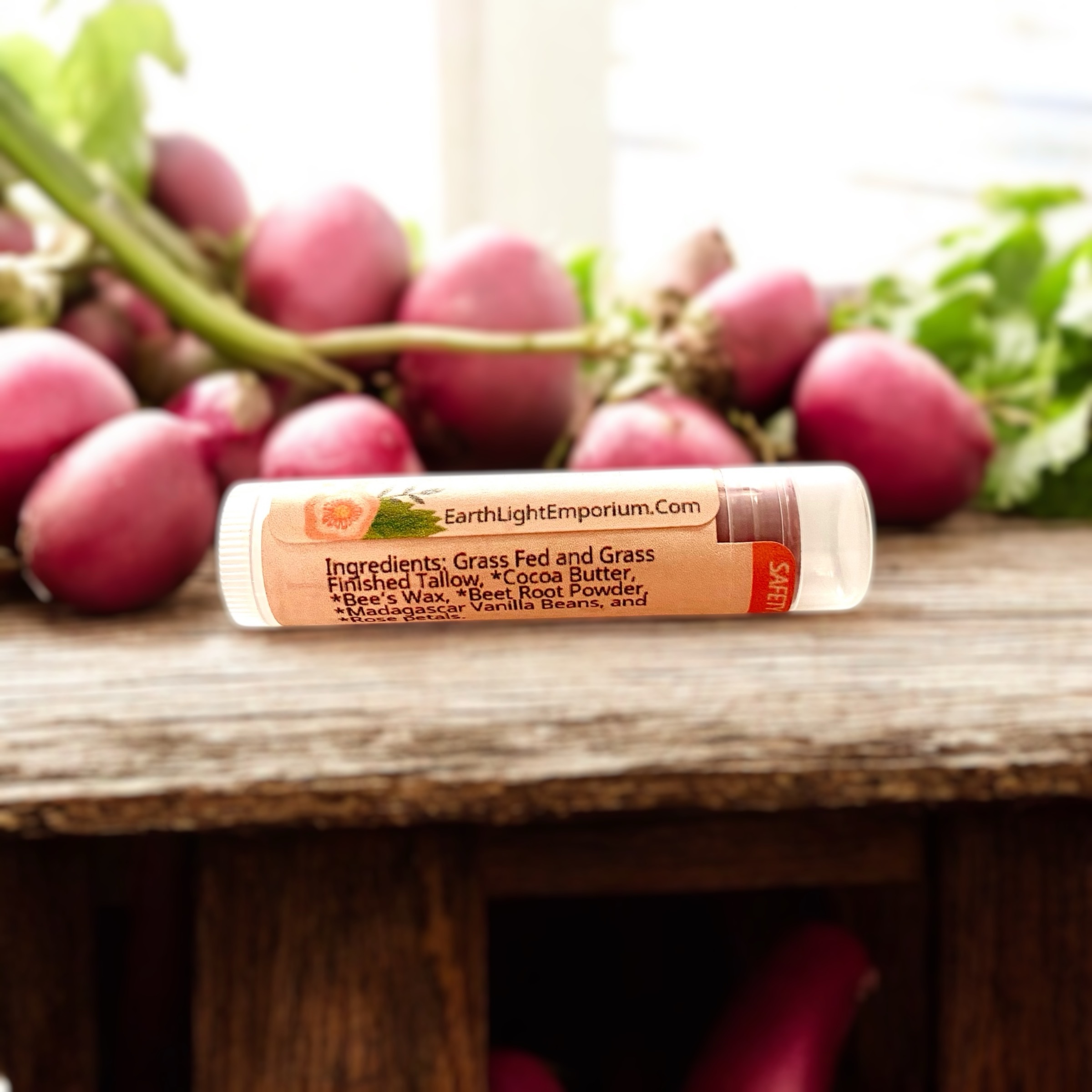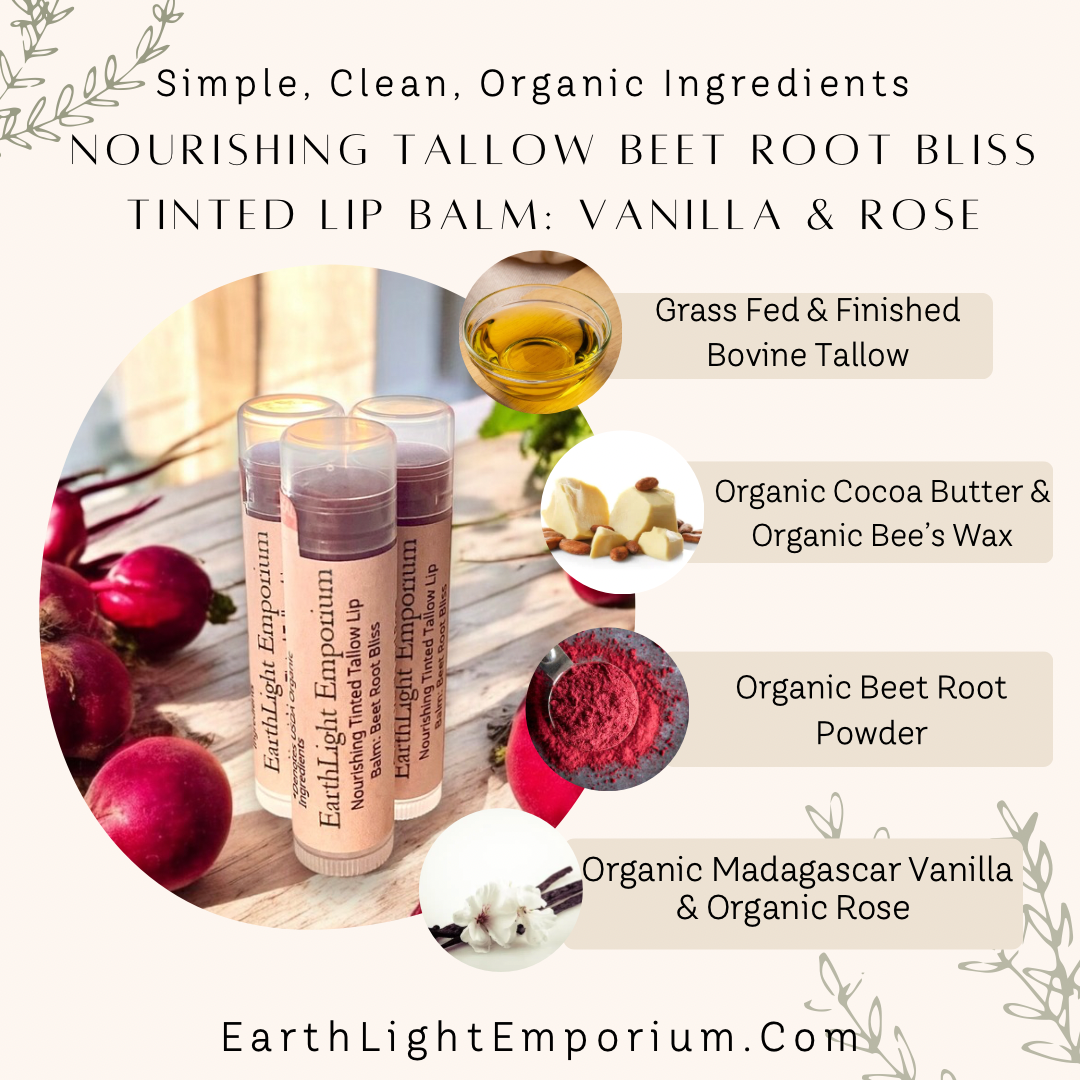 Infused with the calming essence of organic Madagascar vanilla and organic rose, this balm deeply nourishes and hydrates the lips. Vanilla provides soothing antioxidant benefits, while rose offers a gentle, calming scent. Experience hydration that leaves your lips smooth and refreshed.  The Tallow Beet Root Bliss Tinted Lip Balm is perfectly balanced for soft, nourished lips with a touch of natural color. Enjoy a product that is pure, simple, and remarkably effective for everyday use.