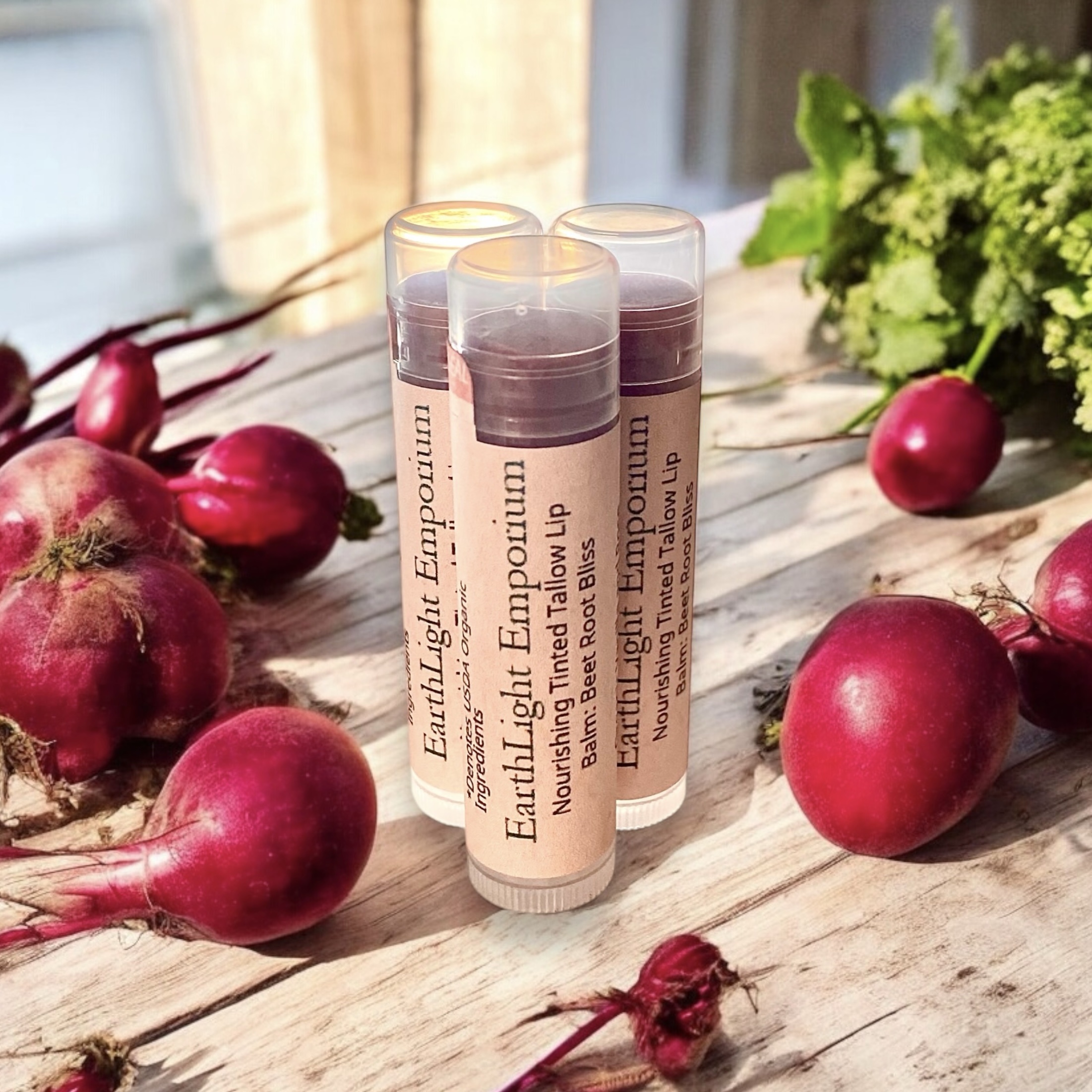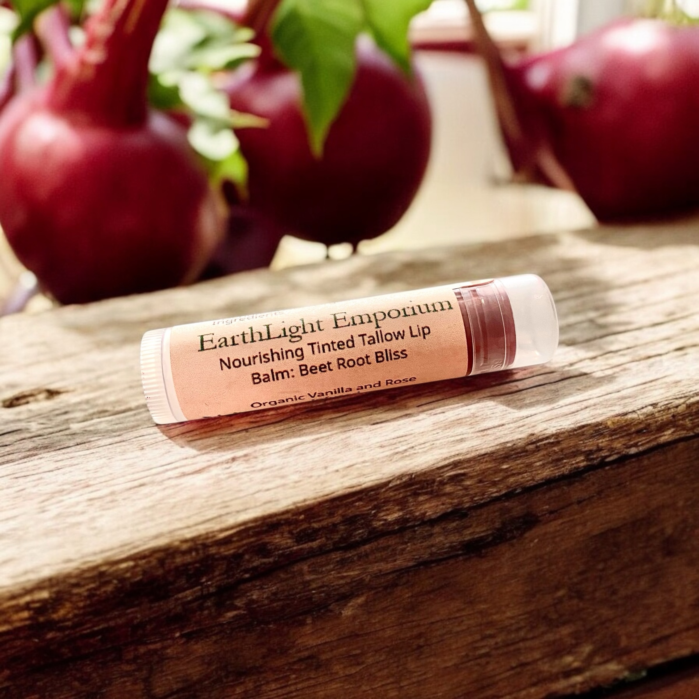 Introducing our nourishing Grass Fed and Finished Tallow Beet Root Bliss Tinted Lip Balm—a luxurious blend of nature’s finest ingredients. This organic balm merges the healing power of tallow with the vibrant hue of beetroot, resulting in a naturally tinted balm that enhances your lips with a soft, flattering color.